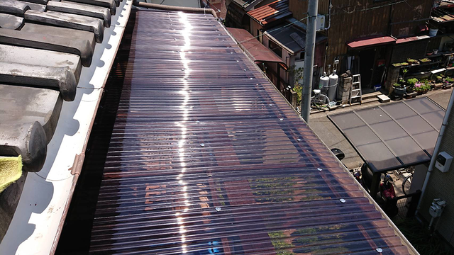築15年のアクリル波板で雨漏りが発生していたため、ポリカ波板に交換させていただきました。