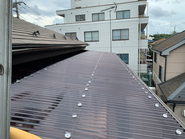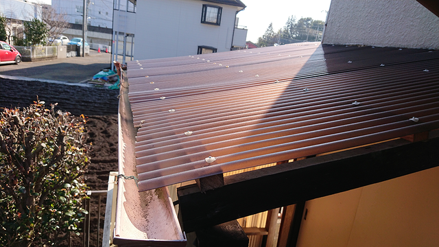 雹(ひょう)によって破損してしまったため、新しい波板と交換させていただきました。